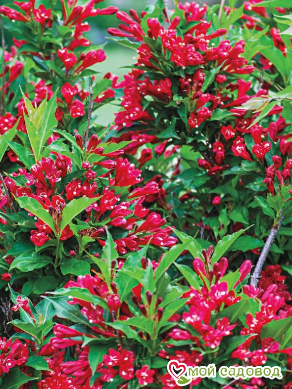 Читать далееВейгела Ред Принц (Weigela hybrida Red Prince) — невысокий раскидистый кустарник до 1,5м высотой и до 1,5м шириной. Цветет обильно в июне. Цветки многочисленные, колокольчатые, ярко-красные до 3,5см длиной, не выгорающие на солнце, собраны в соцветия по 3–4 шт., появляются на побегах прошлого года. Листья насыщенного зеленого цвета. Ежегодный прирост около 20 см. Повторное цветение в конце августа – начале сентября. Любит солнечные места, плодородные дренированные почвы.